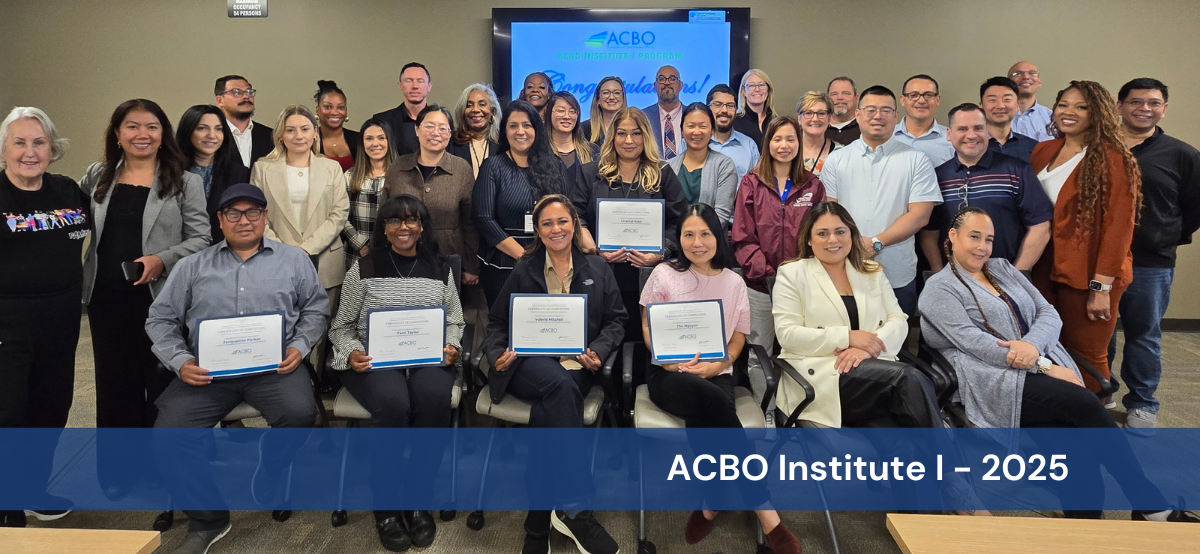The Association of Chief Business Officials offers business officers in California opportunities to develop professionally, to identify issues affecting community colleges, and to share their expertise with their colleagues. Our membership includes 73 districts, 116 California community colleges, enrolling 1.8 million students. ACBO Future Events - Click here to see all upcoming events